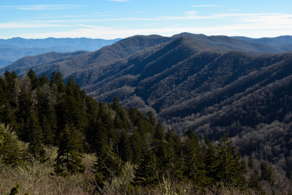 One of the most popular hikes is 4 mi Chimney Tops. It was our original plan to climb to the top of it, but because of the crowds and heavy rains a day before we adjusted our plan. We were advised at the visitor center to drive to the Newfound Gap for the views and quick hike. Unfortunately, there were no leaves on the trees nor snow so we missed the most beautiful views.