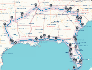 • Day 2: explore New Orleans, LA; drive to Biloxi, MS (90 mi, 2 h); drive to Mobile, AL (65 mi, 1 h); drive to Pensacola Beach, FL (70 mi, 1.2 h)
